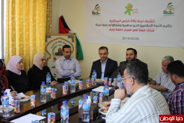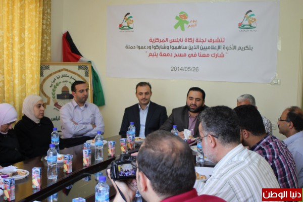 قامت لجنة زكاة نابلس المركزية بتكريم الصحفيين الذين شاركوا في حملة " شارك معنا في مسح دمعة يتيم ",حيث انطلقت الحملة منذ مطلع شهر نيسان/2014 واستمرت لمدة شهر ونصف وكان هدف الحملة إيجاد كفالات لـ 357 يتيما مسجلين لدى اللجنة وتسعى اللجنة لإيجاد كفالات لهم , حيث أن اللجنة تكفل ما يزيد على 3000 يتيم بتبرع من مؤسسات خيرية داخل الوطن وخارجه ,وقد انطلقت الحملة من غرفة تجارة وصناعة نابلس مرورا بملتقى رجال الأعمال ,