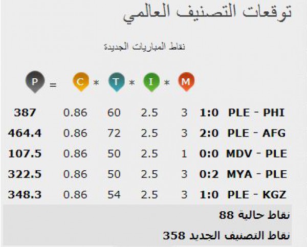 ووفقاً للحسابات المطروحة على موقع الاتحاد الدولي لكرة القدم، فان المنتخب الفلسطيني الذي يوجد في رصيده الحالي 88 نقطة، قد رفع رصيد إلى 358 نقطة ، بعد تحقيقه الفوز في 3 مباريات والتعادل في مباراة أخرى في البطولة.