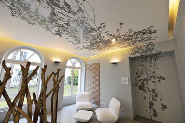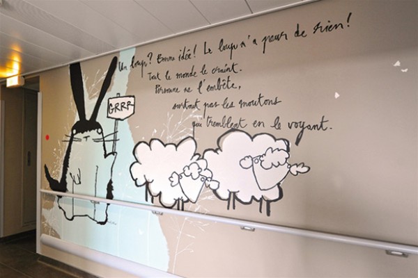 ...المساحات الكبيرة لا تخيف المبدعين حتى عندما تتمدد احيانا على مساحات واسعة. مساحات يغطيها الطلاء بشكل مباشر فوق الجدار، مدعوما بنسيج من الفينيل. وكل ذلك باسلوب يبث الفرح مع كل لون وتشكيل.