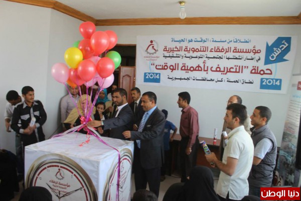 دشنت مؤسسة الرفقاء التنموية الخيرية اليوم الأربعاء الموافق 4-6-2014م حملة (التعريف بأهمية الوقت)برعاية المشير عبد ربه منصور هادي - رئيس الجمهورية وبمناسبة أعياد الوحدة الوطنية المباركة وفي إطار أنشطتها المجتمعية التوعوية والتثقيفية التي تستهدف كل محافظات الجمهورية .