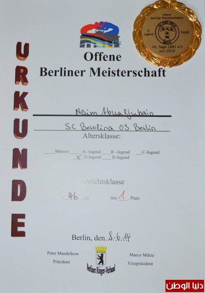 للمرة الثانية خلال عامين، فاز الطفل الفلسطيني نعيم سهيل أبو الجبين، أحد أبناء الجالية الفلسطينية في المانيا، ببطولة برلين المفتوحة للمصارعة لزن 46 كلغ، لهذا العام.