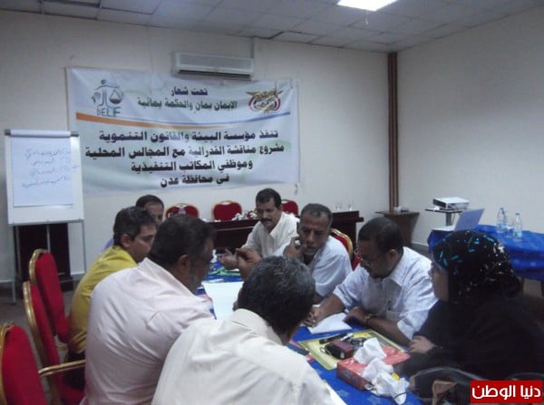 اختتمت مؤسسة"البيئة والقانون" التنموية DELF ظهر اليوم الأربعاء الموافق 12 يونيو 2014م فعاليات ورشة العمل الثانية ضمن مشروع"مناقشة الفيدرالية مع المجالس المحلية"، بمشاركة 50 موظف من المجالس المحلية في كل من مديريتي التواهي والمعلا بمحافظة عدن، والتي استمرت على مدى يومين متواصلين.