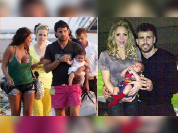 من اليمين: بيكيه وشاكيرا وطفلهما ميلان، ثم فابريغاس ودانييلا لطفلتهما ليا