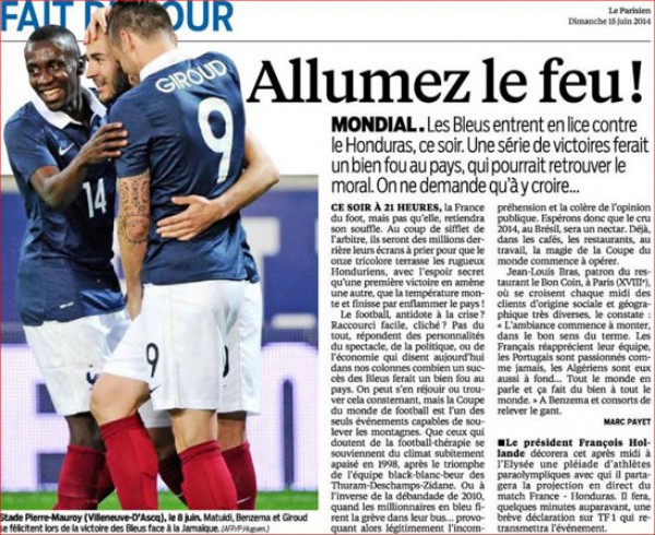 أما صحيفة "لوباريزيان" فكتبت، "نحن فى حاجة إلى الفرحة"، فى إشارة إلى ضرورة تحقيق الفوز فى مباراة الليلة على هندوراس.