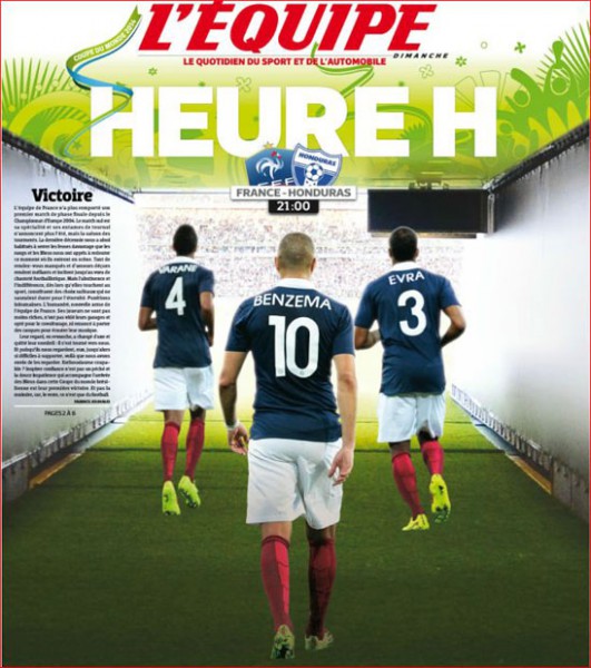 وعنونت صحيفة "ليكيب"، "الساعة المرتقبة"، فى إشارة إلى موعد انطلاق المباراة الافتتاحية للمنتخب الفرنسى فى المونديال، فيما وضعت صورة رئيسية تضم الثلاثى "باتريس إيفرا، فاران، كريم بنزيمة".
