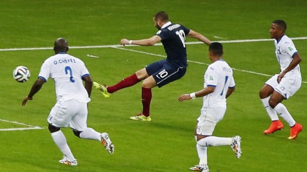 وسدد بنزيمة الكرة من مدى قريب لتصطدم بالقائم ثم بنويل باياداريس حارس مرمى هندوراس الذي أمسكها على مرتين.