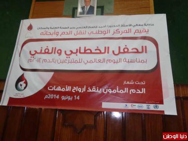 أقيم صباح يومنا هذا بقاعة نادي ضباط الشرطة بصنعاء حفل فنياً وخطابياً بمناسبة اليوم العالمي للتبرع بالدم وفي الحفل الذي حضره وزير الصحة العامه والسكان الدكتور : أحمد قاسم العنسي وممثل منظمة الصحة العالمية الدكتور: أحمد شادول وعدد من اعضاء مجلس النواب والمتهمين بالشان الصحي وجمع خفير من