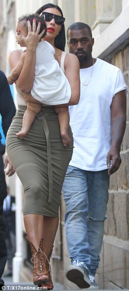 وبدت الطفلة في الصور مرتدية ثوبا أبيض بالتناسق مع ملابس كيم، التي كانت ترتدي ملابس ضيقة تبرز مفاتن جسدها، وهي تي شيرت أبيض وجونلة أخضر زيتوني مرتفعة الوسط.