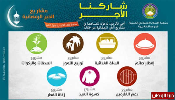 دعا مدير فرع الجمعية الأستاذ منصور عبده المسوري، كافة التجار والداعمين والمؤسسات والجمعيات الخيرية إلى الالتفات لمحافظة ريمة الأكثر تضرراً من الأزمات الاقتصادية والمعيشية المتتالية وإعطائها أولوية خاصة في دعم مشاريع الخير الرمضانية هذا العام 2014.