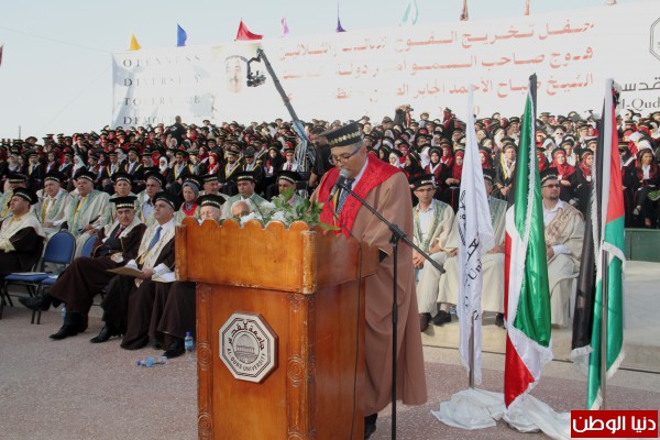 وفي كلمته افتتح رئيس مجلس أمناء الجامعة أحمد قريع "أبو العلاء" كلمته ليوجهها للخريجين قائلا:" نلتقي اليوم لاقتناص لحظة فرح حقيقية، وكأننا نشعل شمعة وسط عتمة هذا الليل الفلسطيني الطويل، لنستمد منها قبساً من الامل والتفاؤل، ولنستلهم من فيضها قسطاً من العزم والثقة بمستقبل فلسطين وشعبها، الذي يواصل ملحمة الصمود على هذه الارض الطيبة، ويراكم من خطواته على طريق التمكين والجدارة، فتحية لكم جميعاً، تحية الوطن العظيم، لأبنائه الذين حملوه في عقولهم وقلوبهم، ووضعوه في حدقات عيونهم، وناضلوا من اجل استقلاله وحريته جيلاً بعد جيل، تحية الفخر والاعتزاز لكم أيها الخريجون، وأنتم تحملون لواء العلم، والمعرفة لتظل راية فلسطين خفاقة في السماء، رغم القهر والظلم والعدوان، فالقدس عاصمتنا الأبدية، تتعرض اليوم لعمليات التهويد والاسرلة لتغيير معالمها الحضارية والثقافية والتاريخية والدينية، ويتعرض أهلها لعمليات الاقتلاع والتهجير، ومقدساتها للانتهاك، ومؤسساتها الثقافية والاجتماعية والاقتصادية والدينية للاغلاق، وبيوتها للهدم، وشبابها للسجن والاعتقال، ومعالمها للتزوير، القدس هذه ستظل عربية إسلامية، وحقوقنا فيها لن تضيع ولن يفرط بها أحد، ومقدساتها ستبقى إسلامية ومسيحية مهما بلغ الظلم والعدوان بصمود أهلها ودفاعهم عنها، والقدس هذه تنادي بأعلى الصوت كل العرب والمسلمين في العالم: "القدس في خطر والاقصى يناديكم"