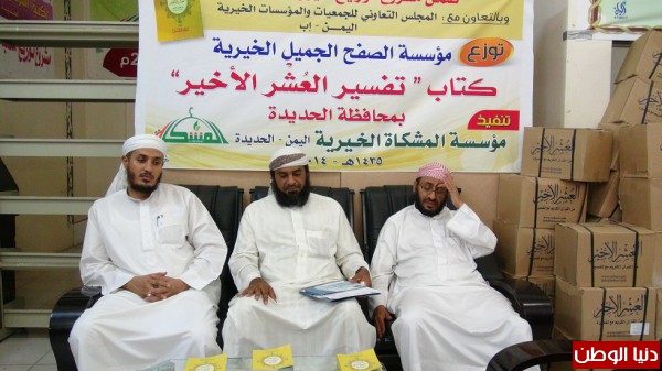 وأوضح الشيخ / إبراهيم حسن رامي رئيس مؤسسة المشكاة الخيرية بالحديدة بأن المؤسسة دشنت يوم أمس توزيع كتاب تفسير العُشر الاخير من القرأن الكريم والذي يأتي توزيعة تزامناً مع حلول شهر رمضان المبارك بالتنسيق مع مؤسسة الصفح