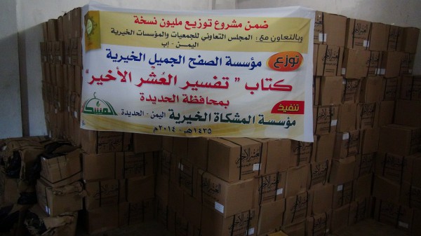 نفذت مؤسسة المشكاة الخيرية بمحافظة الحديدة يوم أمس توزيع 130 الف نسخة من كتاب تفسير العُشر الأخيرمن القرأن الكريم وذلك ضمن مشروع توزيع مليون نسخة بمحافظات الجمهورية والتي تتبنى توزيعها مؤسسة الصفح الجميل الخيرية بالتعاون