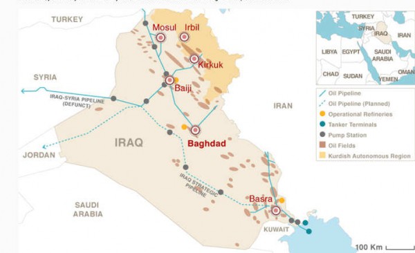 على الخريطة.. مناطق توزع النفط العراقي مقارنة بالمواقع التي تسيطر عليها داعش