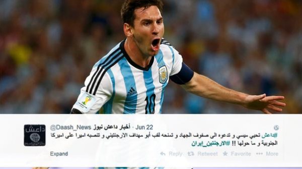 وجاء على الصفحة نفسها :"داعش تحيي ميسي وتمنحه لقب أبو مهداف الأرجنتيني وتدعوه الى صفوف الجهاد وتمنحه لقب أمير على أميركا الجنوبية وما حولها".