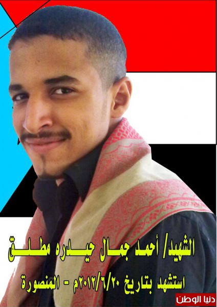 وانطلاقاً من ذلك وبالرجوع الى طبيعة مهامكم عبر ممثليكم فأنني ابلغكم بأن السلطات الحاكمة قتلت ابني الشاب احمد جمال حيدره مطلق وهو شاب اعزل من اي سلاح بل انه كان على موعد مع امتحانات الثانوية العامة بعد ثلاثة ايام فقط من موعد قتله برصاص قناصة قوات السلطة الحاكمة في عدن في 20 يونيو 2012م التي حاصرت مدينة المنصورة وقتلت العديد من الشباب والاطفال والنساء حينها .