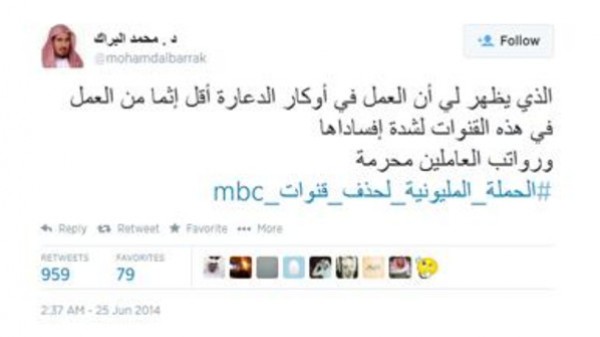 اعتبر كتاب سعوديون ومغردون في "تويتر" أن تغريدة الدكتور محمد البراك، التي هاجم فيها مجموعة "إم بي سي mbc" فيها خرق للقانون الإلكتروني وتستوجب الغرامة والسجن.