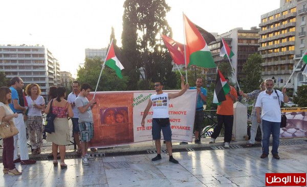 شارك مساء أمس الخميس أبناء الجالية الفلسطينية والمتضامنين من الشعب اليوناني في وقفة تضامنية في ساحة البرلمان اليوناني، إستجابة لنداء إتحاد العمال والشغيلة الفلسطينيين في اليونان، حيث رفع المشاركون في الوقفة الأعلام الفلسطينية ويافطات تضامنية مكتوبة باللغة اليونانية، وصور الشهداء والأسرى.