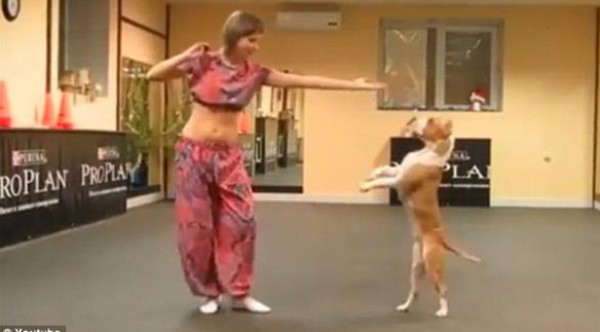 على أنغام أغنية تحمل بإيقاعها موسيقى الرقص الشرقي، رقص كلب من نوع "بيت بول" بمهارة عالية يقيادة من مدربته التي ترتدي أزياء هندية.