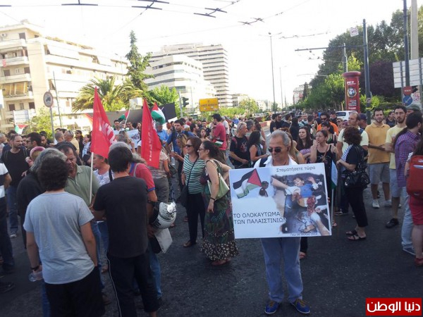 احتشد المئات من المتضامنين اليونان والفلسطينيون والعرب ,استجابة لدعوات لجان التضامن المختلفة واتحاد العمال والشغيلة الفلسطينيين ,امس الخميس مساءا ,امام السفارة الاسرائيلية للاحتجاج وادانة العدوان الوحشي الاسرائيلي المتجدد على غزة , وادانة الوحشيةالاسرائيلية والفاشية والعنصريةالتىتمارسها في عموم الوطن ,وادانة الاستيطان الاسرائيلي الذيهو من الاسباب الرئيسية لضرب غزة وحرف الانظار عن ممارساتة حيالشعبنا بعمومة ,في مسلسل التطهير العرقي المتواصل , حيث هتف المحتشدون بالحياة لغزة والمقاومة ,والادانة لاسرائيل ,حيث قام المعتصمون بحرق العلم الاسرائيلي ,واستمر الاعتصام لأكثر من ساعتين مليء بالحيوية وباللغتين العربية واليونانية مع اغلاق اهم شوارع العاصمة.