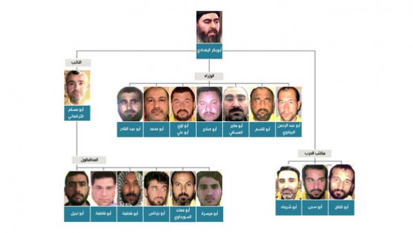 نشرت صحيفة "تيليغراف" البريطانية رسماً توضيحياً يظهر هيكل القيادات التابع لتنظيم الدولة الإسلامية في العراق والشام "داعش"، وعلى رأسه "الخليفة" المزعوم أبو بكر البغدادي.