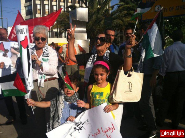إحتشد المئات من أبناء الجالية الفلسطينية والعربية والمتضامنين اليونان استجابة لدعوات لجان التضامن المختلفة واتحاد العمال والشغيلة الفلسطينيين، مساء يوم الخميس 10-7-2014 أمام السفارة الإسرائيلية للاحتجاج وادانة العدوان الوحشي الاسرائيلي المتجدد على أبناء شعبنا في قطاع غزة ، كما وادانة الوحشية الاسرائيلية والفاشية والعنصرية التي تمارسها في عموم الوطن ,وادانة الاستيطان الاسرائيلي الذي هو من الاسباب الرئيسية لضرب غزة وحرف الانظار عن ممارساتة حيال شعبنا في مسلسل التطهير العرقي المتواصل.