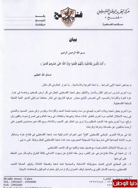 حركة التحرير الوطني الفلسطيني فتح إقليم مصر تصدر بيانا تدين فيه العدوان على أهل غزة