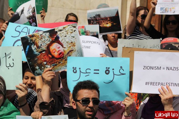 "لن تكون الجزائر بخير ما دامت فلسطين محتلة" هذا كان أحد أبرز الشعارات التي أطلقها المشاركون الذين رفعوا لافتات متضامنة مع معاناة الغزاويين وغاضبة من الصمت العربي ومطالبة بفتح معبر رفح البري كما رفع المتضامنون صور المجازر التي يشهدها قطاع غزة جراء هذا العدوان غير المسبوق ضد المدنيين كما ارتفعت أصوات تنادي بتطوير الوقفات التضامنية إلى حراك شبابي عربي ينشد بدعم غزة بالحاجيات الاساسية على رأسها التبرع بالدم والأدوية في ظل الأزمة الإنسانية التي يعيشها القطاع وهذه كانت ثاني ظاهرة