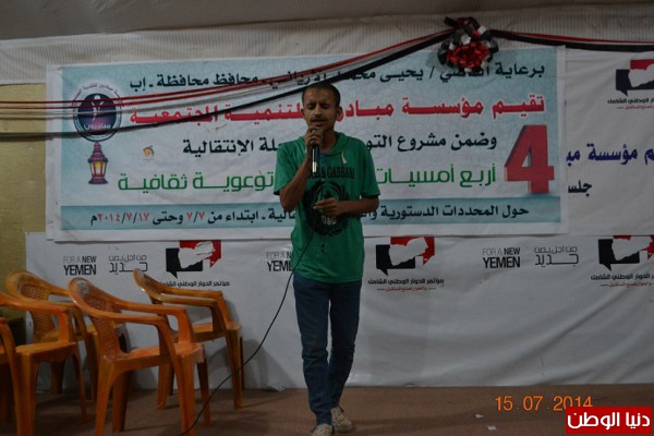في أطار مشروع خيمة التوعية بالمرحلة الانتقالية بمحافظة إب أقيمت مساء اليوم الاثنين الموافق 14/7/2014م الأمسية الرمضانية الثالثةللأدباء والشعراء الشباب أقامتها مؤسسة مبادرون للتنمية المجتمعية في اطار دعم ومساندات مخرجات مؤتمر الحوار الوطني الشامل.