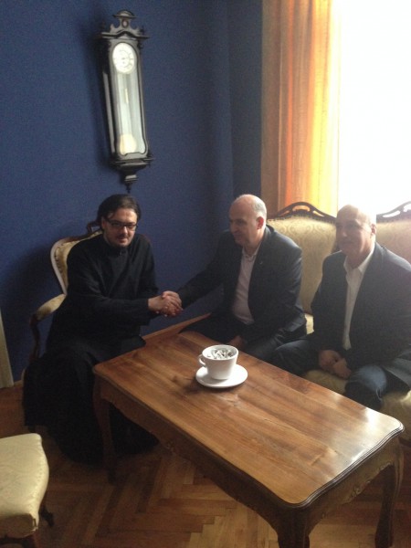 في إطار الفعاليات التي تقوم بها جمعية الجالية الفلسطينية في البوسنة والهرسك لحشد الدعم لشعبنا الفلسطيني الذي يواجه الآلة العسكرية للإحتلال الاسرائيلي في الأراضي الفلسطينية وخاصة في قطاع غزة الصامد التقى رئيس الجالية الأخ ماجد معروف ونائب الرئيس الأخ عماد عفانة مع راعي الكنيسة الأرثذوكسية في كانتون سراييفو وممثلها في مجلس الأديان في البوسنة والهرسك الأب فانيا يوفانوفيتش.