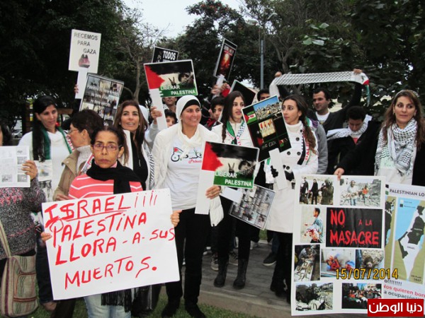 بمشاركة لعدد من برلمانيي البيرو، ومفكرين، وفنانين، وممثلين للقوى الشعبية، ومؤسسات حقوق الانسان، واعضاء من النادي العربي الفلسطيني، والفيدرالية الفلسطينية في البيرو، والجالية الفلسطينية، وجميع القوى المحبة للسلام اعتصموا امام السفارة الاسرائيلية في ليما في مساء يوم امس، الثلاثاء 15/7/2014.