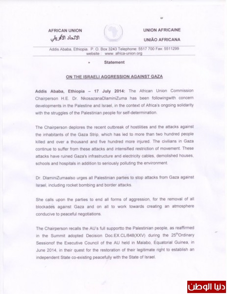 ان رئيسة مفوضية الاتحاد الأفريقي تحث مجلس الأمن الدولي أن يبذل قصارى جهده لوقف العنف ، والعمل على تحقيق سلام عادل وشامل ودائم في المنطقة على أساس مبدأ حل الدولتين، وفقا لحدود 1967 ، وتطبيق أحكام القانون الدولي ذات الصلة والمقررات السابقة للمجلس في هذا الصدد.