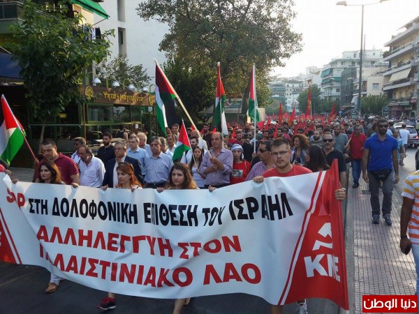 في مظاهرة حاشدة تعدت العشرة آلاف شخص انطلقت مساء امس الخميس 17-7-2014 نحو السفارة الإسرائيلية في اثينا احتجاجاً واستنكاراً للهجمة البربرية الممنهجة على الشعب الفلسطيني وجرائم الإحتلال ومذابحه بحق ابناء شعبنا الفلسطيني والتي نظمها الحزب الشيوعي اليوناني والشبيبة الشيوعية وجزب حركة اليسار اليوناني " سيريزا ".. حيث تقدم المسيرة بالأعلام الفلسطينية الامين العام للحزب الشيوعي الرفيق ذمترس كوتسوباس برفقة سفير فلسطين الأخ مروان طوباسي واعضاء اللجنة المركزية للحزب واعضاء من البرلمان الاوروبي واليوناني وقيادة حزب "سيريزا "وابناء