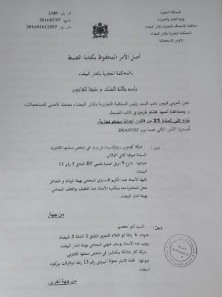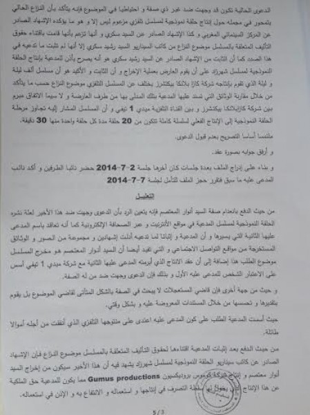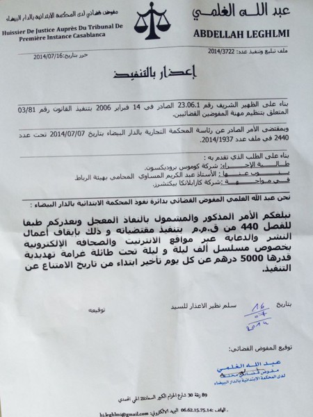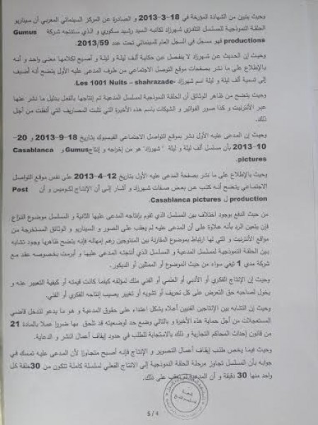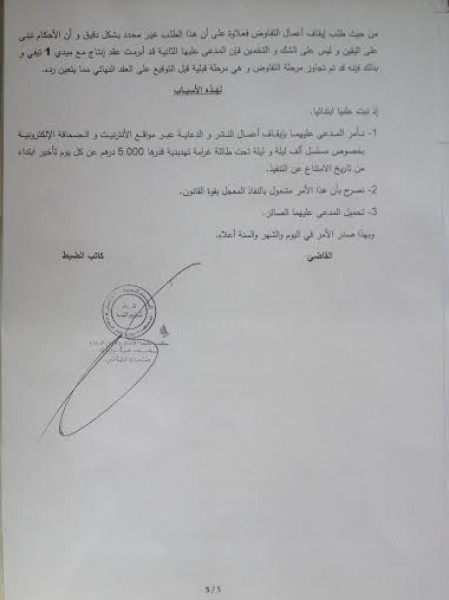 و الحكم الذي تتوفر الجريدة على نسخة منه فإنه يقضي بإيقاف أعمال النشر و الدعاية بخصوص مسلسل ألف ليلة و ليلة ، تحت طائلة غرامية تهديدية قدرها 5000 درهم عن كل يوم تأخير ابتداء من تاريخ الامتناع عن التنفيذ .