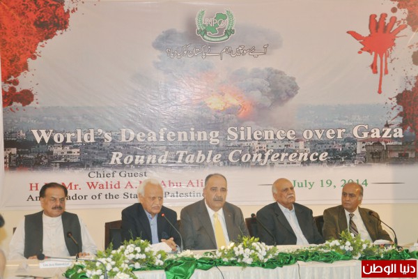 عقدت مؤسسة نظرية باكستان في اسلام أباد ، مؤتمرا بعنوان " الصمت الدولي للحرب على غزة " للتضامن مع الفلسطينيين في الحرب التي يشنها عليهم الكيان "الصهيوني" ، بحضور سعادة سفير دولة فلسطين الأخ : وليد أبو علي الذي ألقى كلمة دعا فيها الأمة الاسلامية للتوحد خلف نضالات الشعب الفلسطيني في مواجهة هذا العدوان الإسرائيلي الغاشم ورفع الظلم عن قطاع غزة الذي يعانى من حصار جائر منذ سنوات ،، وشهدا أيضا المؤتمر حضورا واسعا من الشخصيات الباكستانية والتي تضمنت رؤساء العديد من الأحزاب وقادة الأجهزة العسكرية ولفيف من ممثلين الخارجية الباكستانية وسفراء سابقيين بالسلك الدبلوماسي إلى جانب لفيف من الأخوة سفراء الدول الإسلامية المعتمدين لدى الباكستان ،، إلى جانب ممثل حركة فتح – اقليم باكستان الأخ الدكتور أحمد النحال وممثلين عن الأتحاد العام لطلبة فلسطين وجمهور الصحافة الذي تواجد بغزارة لتغطية هذا الحدث الكبير ..