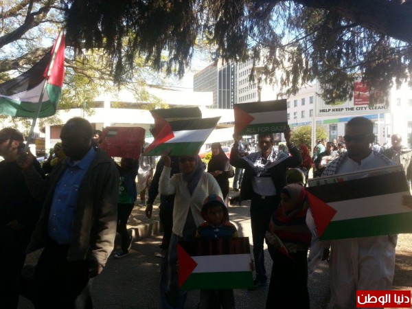في ذات السياق نظمت حركة اصدقاء فلسطين للتضامن بالتنسيق مع سفارة فلسطين مظاهره دعما وتاييدا لاهلنا الذين يعانون تحت القصف الاسرائيلي ويتعرضون للاباده الجماعيه ، حيث قام المتظاهرون بترديد هتافات مؤيده للشعب الفلسطيني وحقه بالدفاع عن نفسه وشجبوا العدوان الذي يقتل الابرياء خاصة الاطفال ومثلوا جنازه للشهيد وحملوا جثث وهميه للاطفال ورفعوا لافتات تنادي بسقوط دولة اسرائيل وضرورة محاكمة مجرمي الحرب "الصهاينة" ونادوا باستقلال دولة فلسطين وقام