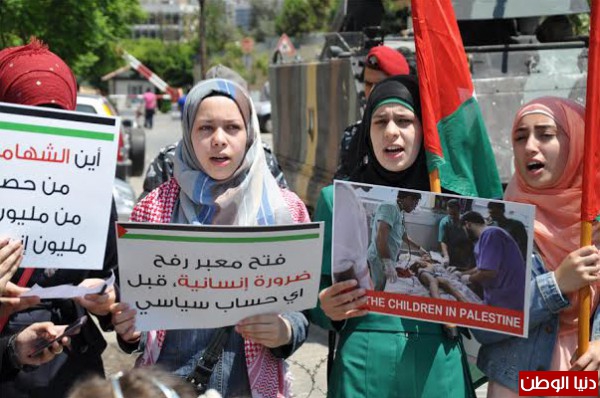 كما حمل الأطفال والنساء يافطات كتب عليها: "مصر أم الدنيا .. لكن يبدو أن غزة ليست ابنتها"، وشعار آخر: "فتح معبر رفح ضرورة إنسانية قبل اي حساب سياسي"، وآخر " مصر ملزمة قانونياً بقتح معبر رفح"، وشعار آخر: "العدوان العسكري هو للقتل السريع والحصار هو للقتل البطيء"، ويافطة كتب عليها: "الله يرحم أيامك يا حسني مبارك".
