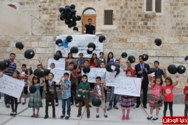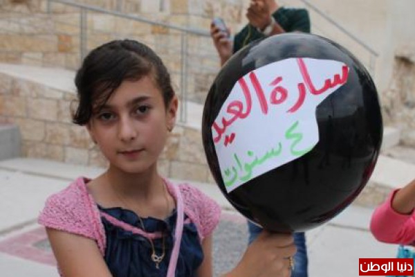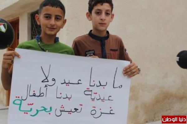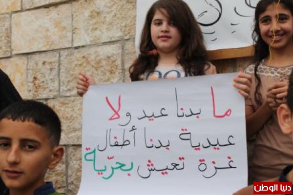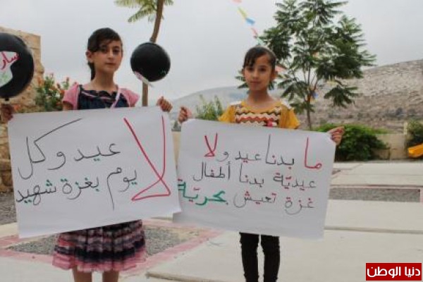 أطفال قرية نصف جبيل في محافظة نابلس يطلقون بالونات بأسماء شهداء أطفال غزة في أول ايام عيد الفطر ، ورفعوا لافتات تضامنا مع أهلنا في قطاع غزة
