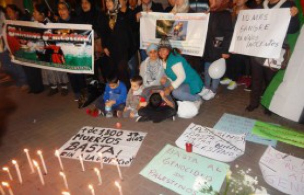 وقد اضيئت شموع من المشاركين ورفعت الاعلام الفلسطينية وشعارات تندد بحرب الاباده ضد الاطفال والنساء والشيوخ والتدمير اليومي خارقين القانون الدولي وحقوق الانسان.