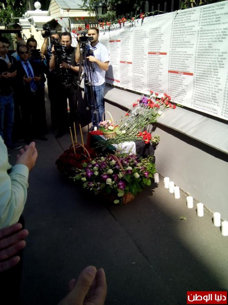 "لن ننسى .. ولن نسامح "أسماء شهداء العدوان الإسرائيلي على جداريه كبيره في سفارة فلسطين في موسكو