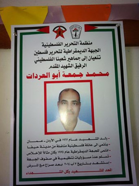 نظمت الجبهة الديمقراطية في منطقة صور مهرجانا تأبينيا للشهيد القائد محمد جمعة أبو العردات "أبو يزن" ، وذلك بعد مرور ثلاثة أيام على رحيله، بعد ان عاني في نزوحه عن مخيمات سورية آلام النزوح والمرض الذي فتك به مؤخرا وهو في زهرة شبابه.
