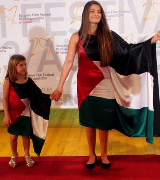 حيث ظهرت الفنانة البوسنية "سابينا سابي" خلال مهرجان سراييفو السينمائي بصحبة ابنتها، وهما ترتديان فستانين على هيئة علم فلسطين.