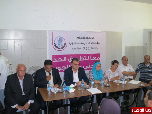 وأوضح شاهر سعد رئيس اتحاد العام لنقابات فلسطين أن اليوم هو الأول في انطلاق حملة تطبيق الحد الأدنى للأجور مع النساء وهن الاكثر انتهاكا للحد الادنى للاجور وجه سعد نداء واضح من اجل فضح كافة المشغلين الذين يشغلون النساء باقل من الحد الادنى للاجورمعتبرا ذلك ظلم للمراة داعيا لاحترام المراة وكرامتها وعملها .