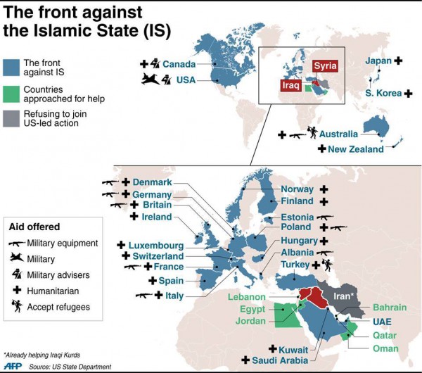 - فرنسا: تسليم اسلحة للبشمركة و58 طناً من المساعدات الانسانية الى منطقة اربيل منذ شهر. واكد الرئيس فرنسوا هولاند الاسبوع الماضي اهمية «الرد السياسي والانساني واذا تطلب الامر العسكري بما يتضمن احترام القانون الدولي». وقال مصدر دبلوماسي انه سيكون «منطقيا» ان تشارك باريس في ضربات جوية، لكن لم يتم اتخاذ اي قرار بعد.