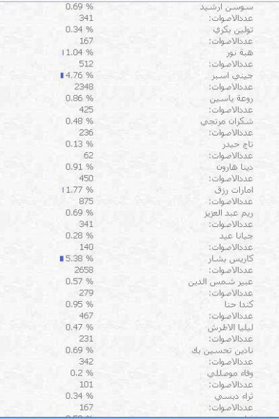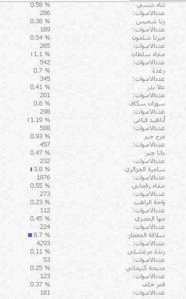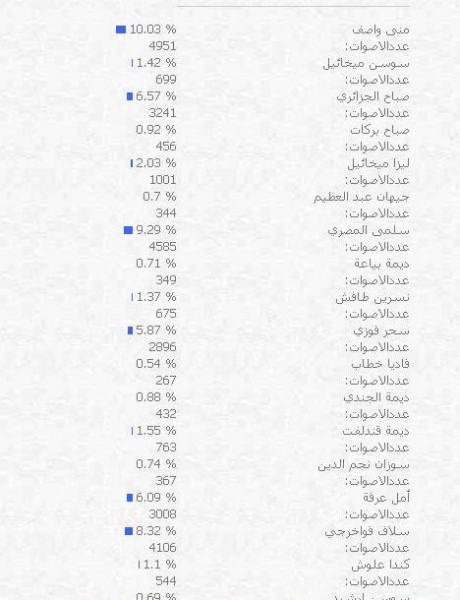 وحصلت الفنانة أمل عرفة على المركز السادس بـ8 صوت ، والفنانة سحر فوزي على المركز السابع حيث حصلت على 896 صوت ، والفنانة كاريس بشار المركز الثامن وحصلت على 4 صوت ، والفنانة جيني اسبر على المركز التاسع بعدد أصوات قدره 8 صوت ، ليكون المركز العاشر من نصيب الفنانة سامية الجزائري التي نالت 876 صوت .