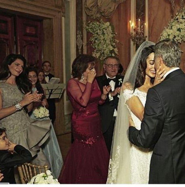 وتظهر في الصورة علم الدين الى جانب كلوني وهم يكادا يتبادلا القبل وتظهر ايضا والدة امل وهي تمسح دموع الفرح بزفاف ابنتها.