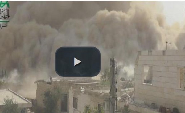 أظهر شريط فيديو بث على موقع "اليوتيوب" لحظة تفجير الثوار لحاجز الدحروج في تجمع الحامدية بريف إدلب، ليخلف التفجير الهائل كمية كبيرة من الدخان والرماد والركام المتطاير على مساحة شاسعة من المكان.