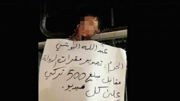 وأفاد المرصد بأن شاباً ملتحياً ووجهه مدمى كان معلقاً الجمعة على عارضة معدنية، علقت معه لافتة كتب عليها بخط اليد: "عبدالله البوشي، الجرم: تصوير مقرات الدولة مقابل مبلغ 500 ليرة تركي لكل فيديو، الحكم: الردة، قتل وصلب لمدة 3 أيام".
