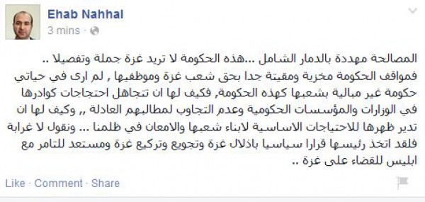 وكتب النحال على الفيسبوك:"المصالحة مهددة بالدمار الشامل ...هذه الحكومة لا تريد غزة جملة وتفصيلا .. فمواقف الحكومة مخزية ومقيتة جدا بحق شعب غزة وموظفيها , لم ارى في حياتي حكومة غير مبالية بشعبها كهذه الحكومة, فكيف لها ان تتجاهل احتجاجات كوادرها في الوزارات والمؤسسات الحكومية وعدم التجاوب لمطالبهم العادلة ,, وكيف لها ان تدير ظهرها للاحتياجات الاساسية لابناء شعبها والامعان في ظلمنا ... ونقول لا غرابة فلقد اتخذ رئيسها قرارا سياسيا باذلال غزة وتجويع وتركيع غزة ومستعد للتامر مع ابليس للقضاء على غزة .."