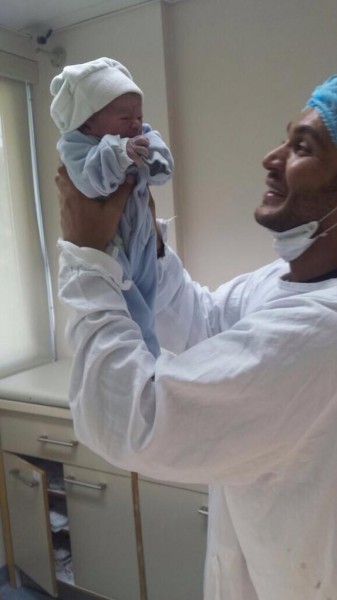 فنشرت صورة جورج وهو يحمل طفله وكتبت :"من كم دقيقة صرت بيّ يا خيي ..دموع الفرح بعيونا كلّنا .. اجا بايبي جو ..الله يخليلكون ياه وتضلو فوق راسو انت وجويل ".