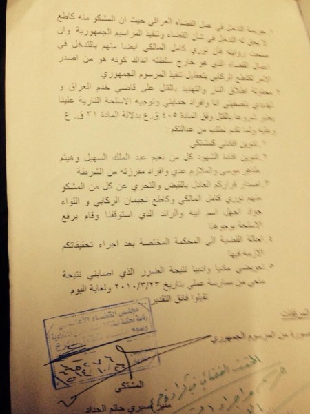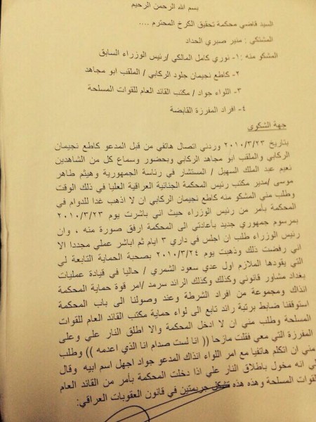 kشر موقع "العراق تايمز" القريب من المرجع الشيعي اليعقوبي والذي يبث من ألمانيا نسخة من الشكوى المقدمة من قبل القاضي منير حداد قاضي المحكمة الجنائية الخاصة التي حاكمت الرئيس العراقي الراحل صدام حسين، والتي أقامها ضد رئيس الوزراء السابق ونائب رئيس الجمهورية الحالي نوري كامل المالكي، مع مدير مكتبه كاطع نجيمان الركابي الملقب بأبي مجاهد الركابي